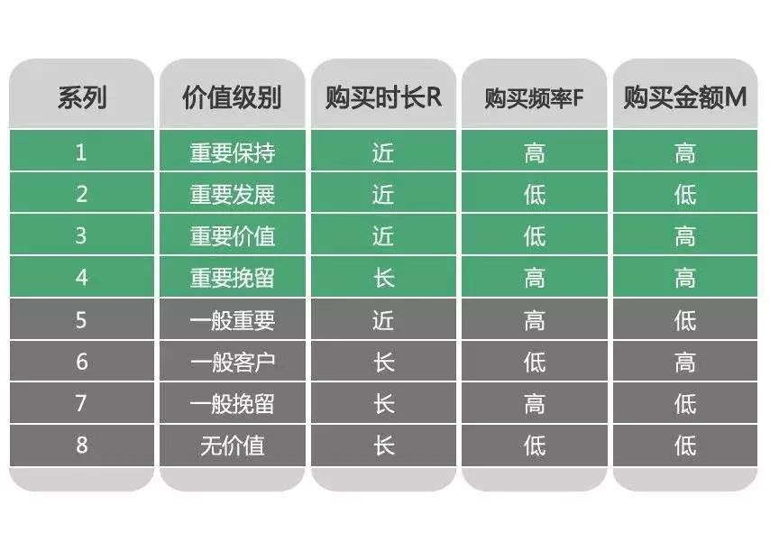 • 一般和低价值客户:C、F、M、L低、R较高。这类客户可能在打折促销时才会选择消费。