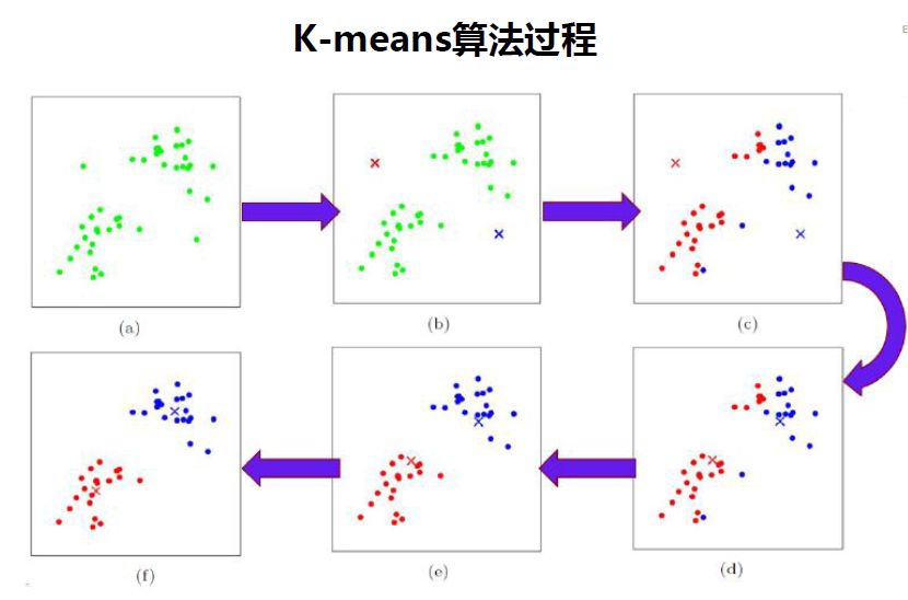 中止条件为:组内最小平方误差MSE最小,或者达到迭代次数,或者簇中心点不再变化。图解: