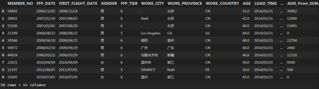 利用pandas包,将数据读入Python环境,查看前10条,看长什么样子data = pd.read_csv(‘C:\\Users\\Administrator\\Desktop\\air_data.csv’, encoding=’utf-8′)