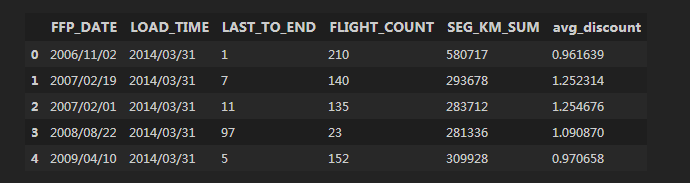 feature = [“客户关系长度”,”消费的时间间隔”,”总消费次数”,”总消费金额”,”平均折扣率”]