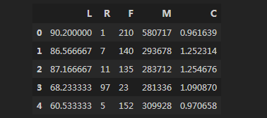 df3=df2[[“L”,”R”,”F”,”M”,”C”]]
