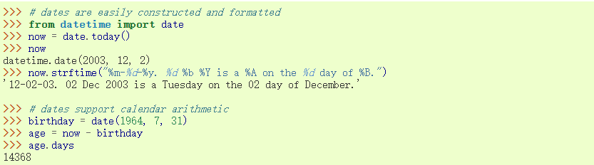 datetime 模块提供了操作日期和时间的类, 包括了简单和复杂两种方式. 当我们知道了时间和日期的 算法后, 工作的重心便放在了如何有效地格式化输出和操作之上了. 该模块也提供了区分时区的对象.